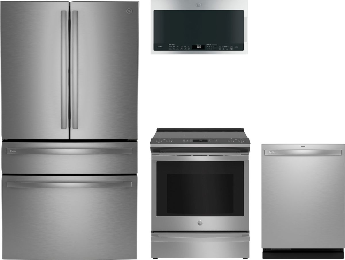 GE Profile™ 4 Piece Stainless Steel Kitchen Package with a French door refrigerator, slide-in electric range, built in dishwasher and over the range microwave.Read More