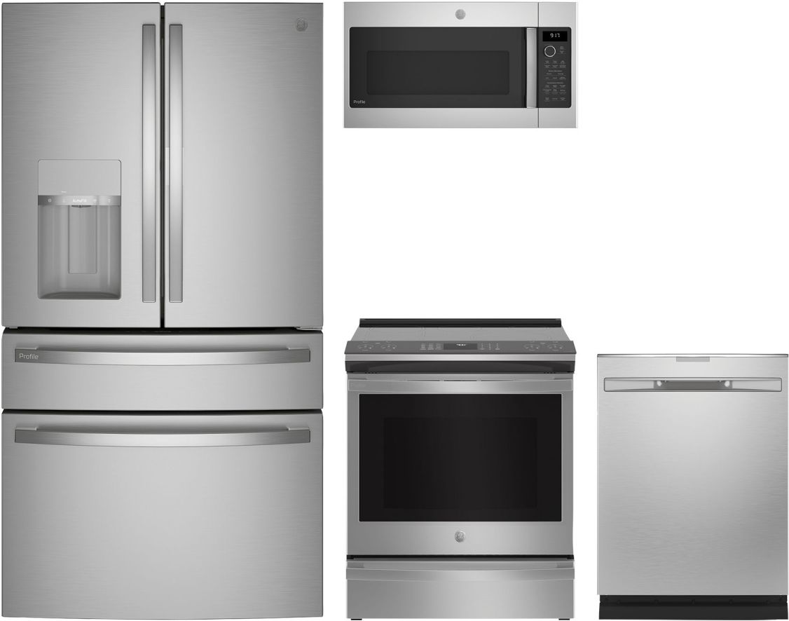 GE Profile™ 4 Piece Stainless Steel Kitchen Package with a french door refrigerator, over the range microwave, built in dishwasher, and slide in induction rangeRead More