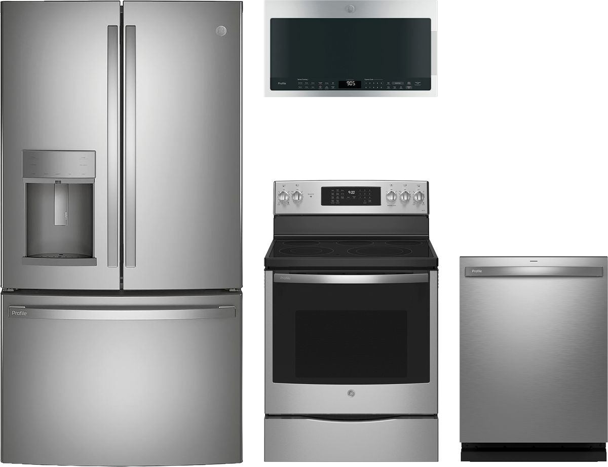 GE Profile™ 4 Piece Stainless Steel Kitchen Package with a French door refrigerator, freestanding electric range, built in dishwasher and over the range microwave.Read More