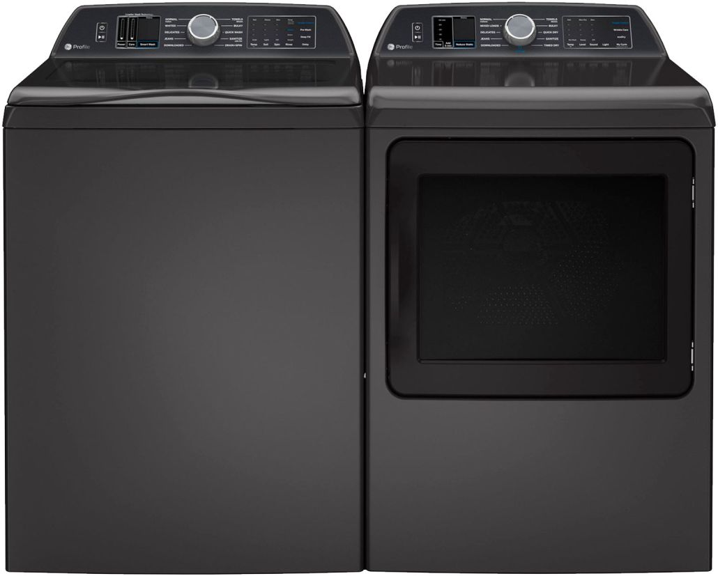 GE Profile™ Diamond Gray Laundry Pair with a 5.4 cu. ft. capacity top load washer and a 7.4 cu. ft. capacity front load gas dryer.Read More