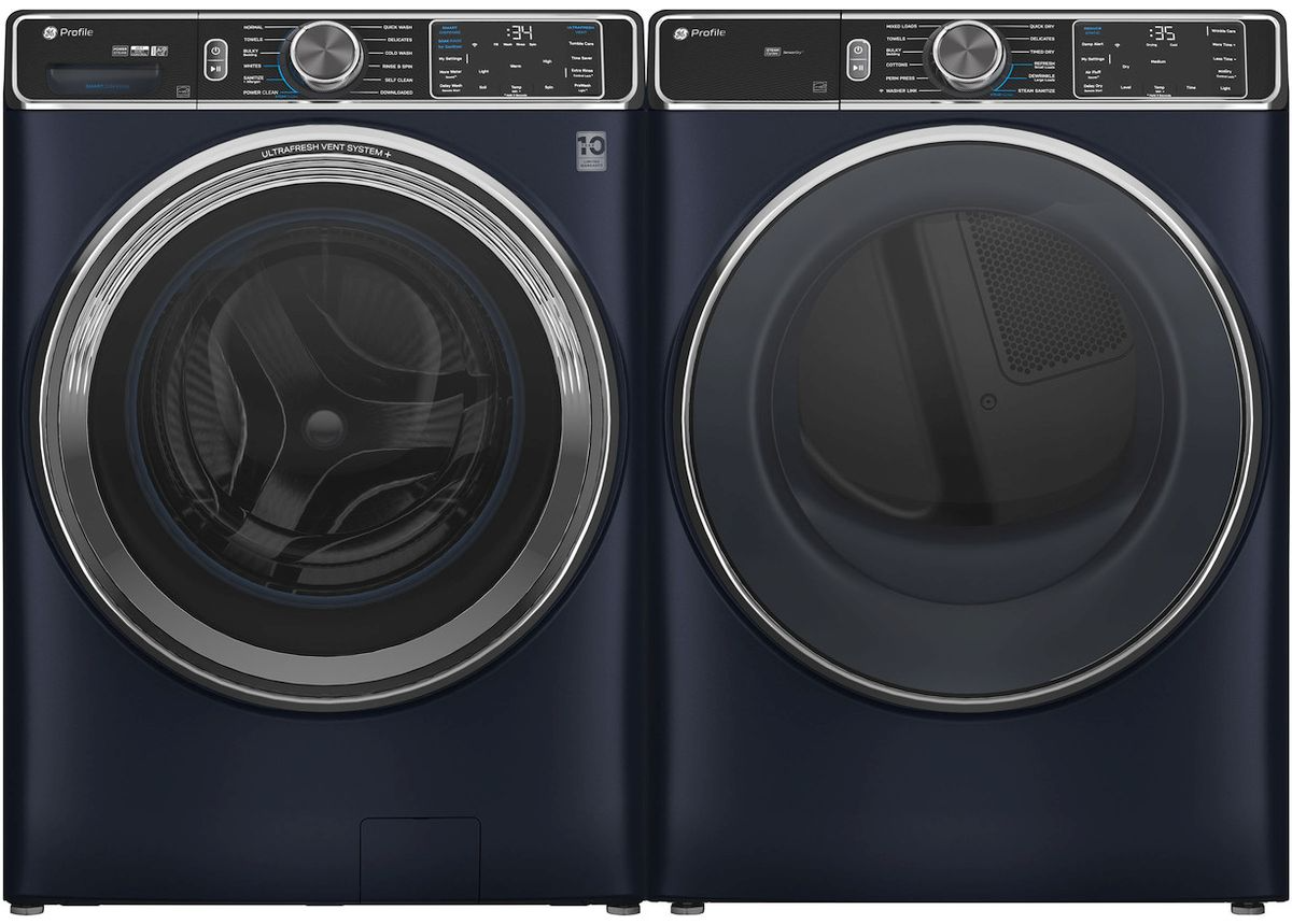 GE Profile™ Sapphire Blue Laundry Pair with a 5.3 cu. ft. capacity top load washer and a 7.8 cu. ft. capacity front load electric dryerRead More