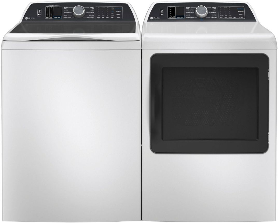 GE Profile™ White Laundry Pair with a 5.3 cu. ft. capacity top load washer and a 7.4 cu. ft. capacity front load electric dryer.Read More