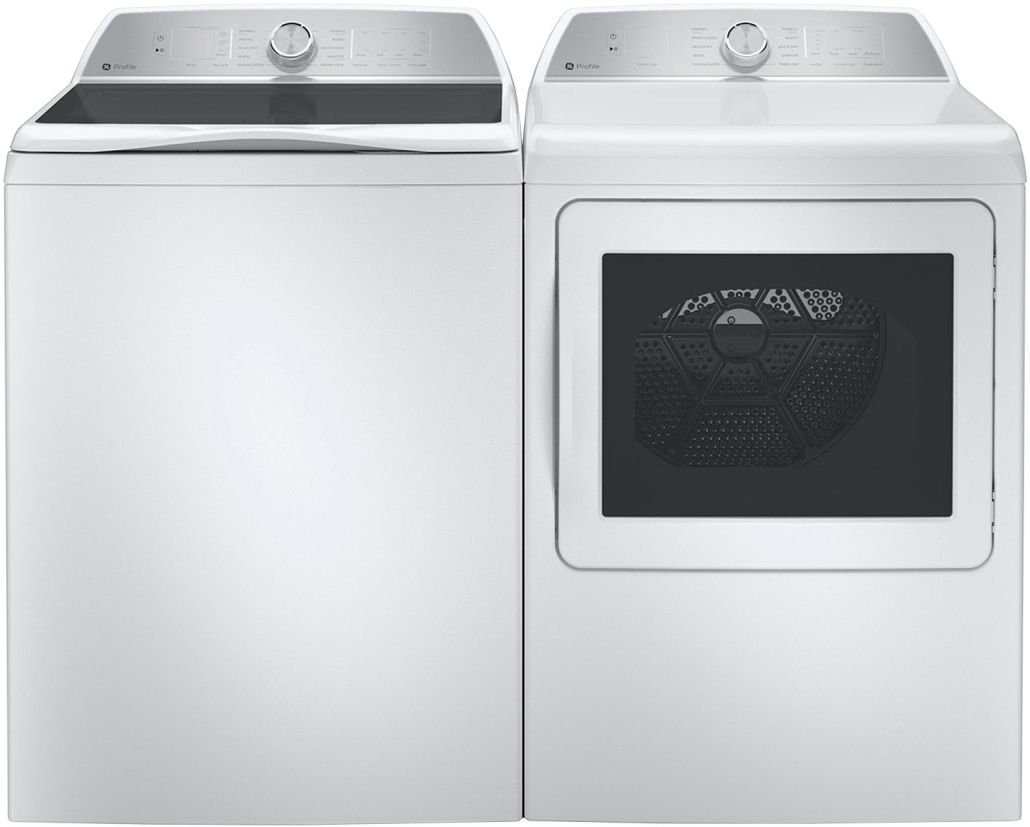 GE Profile™ White Top Load Laundry Pair with a 5.0 cu. ft. capacity top load washer and a 7.4 cu. ft. capacity front load gas dryer.Read More